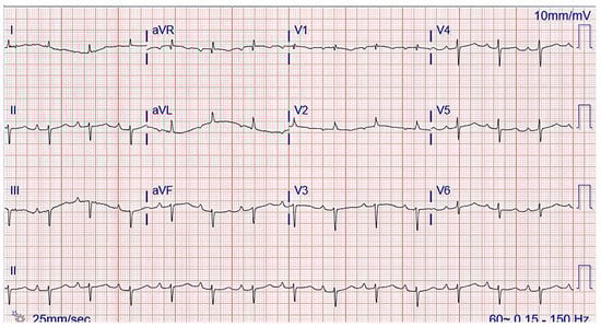The chest radiograph did not show any acute findings. Electrocardiogram (ECG) (Figure 1) showed normal sinus rhythm with first-degree atrioventricular block, left axis deviation, and low voltage in limb leads. No prior echocardiogram (ECHO) was available, so an initial ECHO was obtained showing preserved ventricular ejection fraction (EF), moderate left ventricular hypertrophy (LVH), stage II diastolic dysfunction, and small pericardial effusion (Figure 2 and Figure 3).