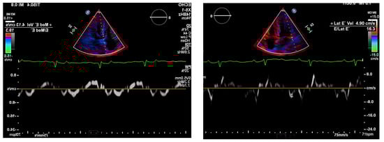 Pulse-wave Tissue Doppler ECHO showing elevated E/E′ ratio and low mitral annulus velocities suggestive of diastolic dysfunction.