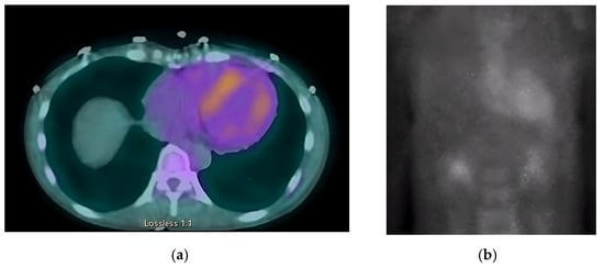 SPECT in an ATTR cardiac amyloidosis patient. Evidence of uptake of 99mTc-PYP in the myocardium. (a) Quantitative SPECT/CT; (b) Semiquantitative analysis of 99mTc-PYP myocardial uptake.