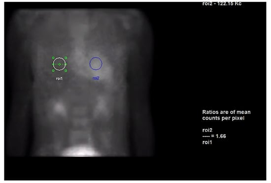 Heart-to-contralateral ratio was calculated by drawing a region of interest over the heart, mirroring it to the contralateral chest, and calculating the ratio of heart ROI to contralateral chest ROI mean counts. The representative image demonstrates a H/CL ratio of 1.6. (H/CL, heart-to-contralateral; ROI, region of interest).