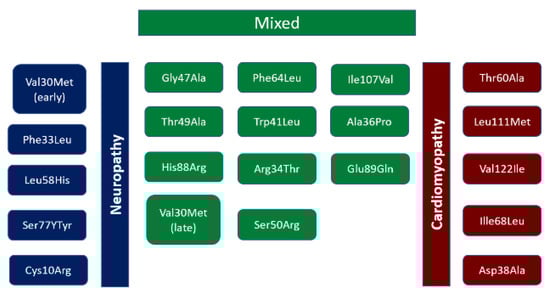 Spectrum of TTR mutations and their phenotypic features. Adapted from Semigran M., J. [22].