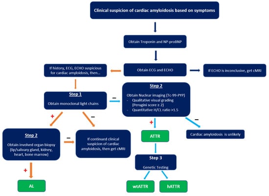 Radionuclide bone scintigraphy uses a bone-avid, phosphate-based isotope (99mTc-PYP) as a noninvasive way to diagnose ATTR. Phosphate-calcium binding seems to play an important role in the myocardial uptake of tracers, though the exact mechanism is unknown. Increased tracer accumulation in ATTR may suggest it has a higher calcium level than AL, and/or the duration of amyloid deposition increases uptake as ATTR has a more indolent course. Scoring cardiac uptake of the tracer is done via a semi-quantitative method using the Perugini grading scale (graded from 0–3). It visually compares tracer uptake in the myocardium and ribs of the planar image. 99mTc-PYP with abnormal uptake (grade 2 or 3) in the absence of a monoclonal gammopathy has a specificity and positive predictive value of 100% for diagnosing ATTR-CA. However, genotyping is still required to differentiate hATTR and wtATTR. If hATTR is present, first-degree relatives should be tested for the identified variant [25]. A heart-to-contralateral lung ratio > 1.5 has a 97% sensitivity and 100% specificity in differentiating ATTR from AL [28]. In patients with a monoclonal gammopathy, scintigraphy alone cannot be used to diagnose ATTR, and an endomyocardial biopsy (EMB) is required for diagnosis. Currently, imaging techniques allow for an accurate and noninvasive method to diagnose ATTR without the need for confirmatory myocardial biopsy. However, if you need to differentiate ATTR with concomitant MGUS from AL, an EMB is indicated. Lastly, a plasma cell dyscrasia with equivocal cardiac imaging findings is another indication for EMB [28].