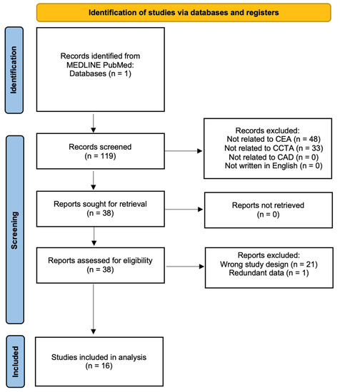 A search was conducted through the MEDLINE database using PubMed. A total of 119 manuscripts were located in this database by using a combination of several key terms including “computed tomography,” “CT,” “coronary,” “angiography,” “CCTA,” and “cost-effectiveness.” Studies were selected if they conducted cost-effectiveness analysis (CEA) on the utility of CCTA in diagnosing CAD compared to other diagnostic modalities. The three inclusion criteria were determined as (1) the study must have employed their own data and/or data from a registry or healthcare institution to examine the cost-effectiveness of CCTA, (2) CAD must be the primary pathology being diagnosed by CCTA, and (3) all studies must be in English as demonstrated in the flow diagram (Figure 1) [24]. The manuscripts were screened by abstract and methodology to include only studies that fit the inclusion criteria. There were no restrictions on age, sex, or date of publication. Papers with redundant data, editorials, and other studies that qualitatively analyzed CCTA without exploring cost-effectiveness analysis were excluded. Manual forward and backward searches of citations and bibliographies of all relevant articles were performed. All searches were conducted in November 2021 and repeated in January 2022 by authors RB, LT, and TS. TS resolved any disputes regarding article selection. Ultimately, 16 manuscripts that provided the most relevant information were included in this literature review.