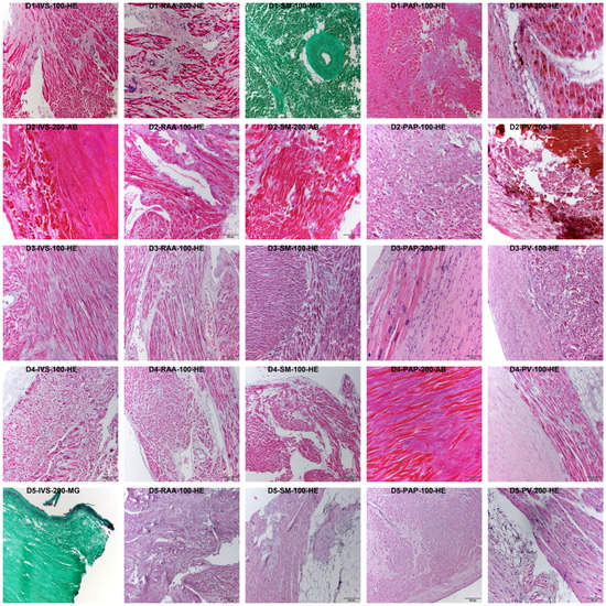 Representative findings in basic histological stains. Per row, one body donor and per column, one sampling site is displayed. Every field has a small heading indicating the body donor (D1—Donor 1, D2—Donor 2, D3—Donor 3, D4—Donor 4, D5—Donor 5), the sampling site (IVS—Interventricular septum, RAA—Right atrial appendage, SM—Septomarginal trabecula, PAP—Anterior papillary muscle, PV—Transition zone of left lower pulmonary vein to the left atrium), the magnification (100–100× magnification, 200–200× magnification), and the basic stain displayed in the picture (AB—Alcian blue, MG—Masson-Goldner-trichrome, HE—Hematoxylin-eosin).
