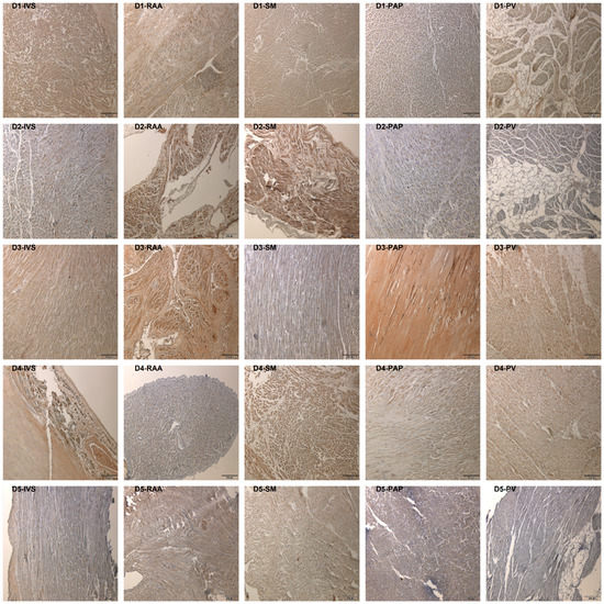 Representative findings in TRPC6-immunohistochemistry. Per row, one body donor and per column, one sampling site is displayed. Every field has a small heading indicating the body donor (D1—Donor 1, D2—Donor 2, D3—Donor 3, D4—Donor 4, D5—Donor 5) and the sampling site (IVS—Interventricular septum, RAA—Right atrial appendage, SM—Septomarginal trabecula, PAP—Anterior papillary muscle, PV—Transition zone of left lower pulmonary vein to the left atrium). All 100× magnification.