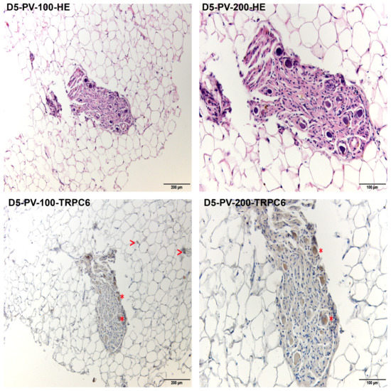 Parasympathetic ganglion in the subepicardial fatty tissue of the left atrium. Every field has a small heading indicating the body donor (D5—Donor 5), the sampling site (PV—Transition zone of left lower pulmonary vein to the left atrium), the magnification (100–100× magnification, 200–200× magnification), and the staining (HE—Hematoxylin-eosin-stain, TRPC6–immunohistochemical labelling of TRPC6). A structure resembling a vegetative ganglion is seen in the center of each field. The two lower images show the repeatedly positive signals (red “*”) found within this structure. Additionally, the surrounding subepicardial fatty tissue presents with scattered positive signals (red ”>”) in areas not affected by wash out of the fat during tissue processing.