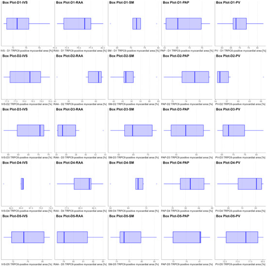 Boxplots showing the distribution of TRPC6-protein positively labelled myocardial area per specimen and donor. Per row, one body donor and per column, one sampling site is displayed. Every field has a small heading indicating the body donor (D1—Donor 1, D2—Donor 2, D3—Donor 3, D4—Donor 4, D5—Donor 5) and the sampling site (IVS—Interventricular septum, RAA—Right atrial appendage, SM—Septomarginal trabecula, PAP—Anterior papillary muscle, PV—Transition zone of left lower pulmonary vein to the left atrium) displayed by the respective box plot (thick line in the box—median; left border of the box—25th percentile; right border of the box—75th percentile; horizontal length of the box—interquartile range; left whisker—25th percentile minus 1.5× interquartile range; right whisker—75th percentile plus 1.5× interquartile range; dots outside the range of both whiskers and the box display outliers).