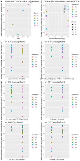 Scatter plots in the comparisons of TRPC6-positively labelled myocardial areas. Both (A) and (B) display summarizing scatter plots according to the subheading. (C–H) visualize the different comparative analyses, with the p-value of the respective test shown in the subheading of each field and the comparison shown as the label of the x-axis. Legends of colors and shapes are displayed on the right side of each diagram. Abbreviations: D1—Donor 1, D2—Donor 2, D3—Donor 3, D4—Donor 4, D5—Donor 5, IVS—Interventricular septum, RAA—Right atrial appendage, SM—Septomarginal trabecula, PAP—Anterior papillary muscle, PV—Transition zone of left lower pulmonary vein to the left atrium, NEP—Nitrite pickling salt-ethanol-polyethylene glycol fixation.