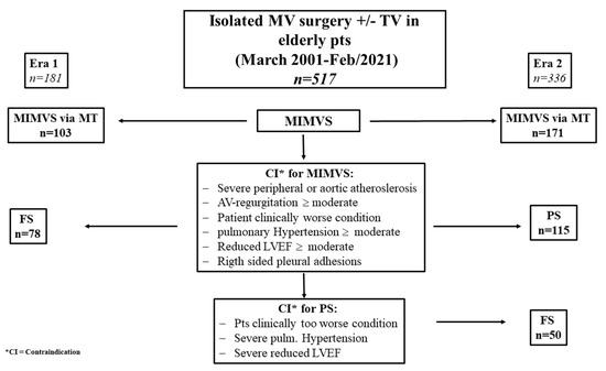 Mitral valve (MV) disease is common in elderly patients and occurs at an increasing frequency with advanced age [1]. However, choosing between conservative, transcatheter and surgical treatment is an individualized process dependent on several factors, which modify morbidity and mortality risk [2,3,4]. Most critical parameters include age, comorbidities, time point of surgical intervention and possibility of repairing the MV pathology [4,5,6]. Due to prolonged life expectancy and the accompanying increase in frailty and concomitant heart failure of elderly patients, surgeons need to seek alternative, reproducible and less harmful algorithms to reduce operative trauma and mortality. An increase in minimally invasive heart surgery has been observed in recent decades [7]. Most of the publications about minimally invasive mitral valve surgery (MIMVS) in the elderly focus on low-risk degenerative MV etiologies [6,8,9]. However, despite the increasing adoption of MIMVS, patients with absolute or relative contraindications for MIMVS exist in daily routine cardiac surgery [10,11]. These certain clinical conditions are potentially harmful limitations for safe MVS via the right MT access type, making FS the sole, alternatively preferred, safe and quick access type in 45% of MV surgeries in almost all German centers [7,12]. Moreover, longer operative times and learning curves associated with the use of long-shafted instruments and endoscopic techniques still prevent the broad acceptance of less-invasive procedures [13]. In addition, MV repair rates in complex pathologies are generally based on institutional experience and may additionally limit the number of patients suitable for MIMVS via MT [14]. However, the benefits of MIMVS in elderly patients and data on transcatheter interventions are inconclusive. Some investigations have demonstrated that MIMVS reduces operative trauma, with long-term survival at five and seven years of 55% and 52%, respectively [8,9,15]. Patients who are considered unsuitable for MT undergo operation with conventional FS. Based on more than 20 years of experience in minimally invasive cardiac procedures, including PS and MT for aortic valve replacement and more than 1000 video-assisted or fully endoscopic MV procedures via MT, we adapted partial upper sternotomy as a complementary, less-invasive mode of access for MVS [16]. In the complexity of MVS approach evolution over the decades, we aimed to keep MV repair rates high and chose a tailored approach for MVS, in order to minimize mortality in elderly patients. In this study, we not only focused on MIMVS in elderly patients with low-risk degenerative MV pathologies, but we also tried to include all higher risk heterogenous MV etiologies and patients with contraindications for MT by implementing a personalized and less-invasive algorithm.