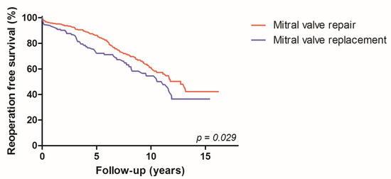 Kaplan–Meier curves: reoperation-free survival benefit of MV repair.