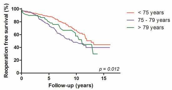 Moreover, the highest 10-year reoperation-free survival rate was observed for the age group 70–74 years (70.3%), decreasing for 75–79 years (60.2%) and being lowest for patients ≥ 80 years (55.8%, p = 0.012) (Figure 4). In addition, the long-term mortality was significantly reduced between era 1 and era 2 in this high-risk patient cohort (log rank p = 0.023).
