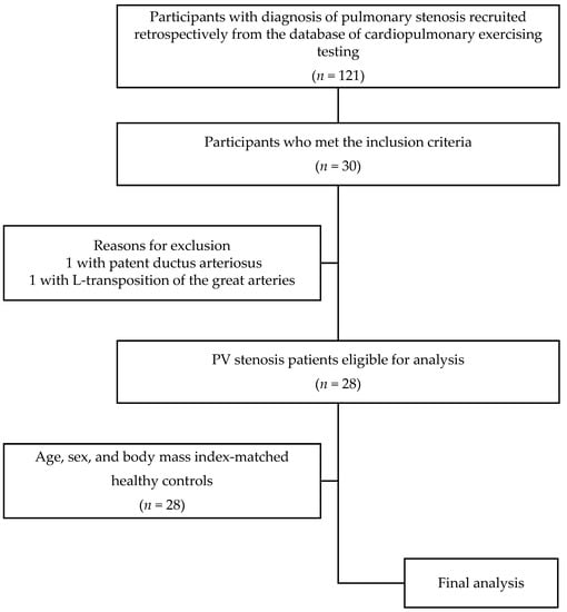 We retrospectively examined the medical records of patients with isolated PS, which were obtained from the Pediatric Outpatient Department of Kaohsiung Veteran General Hospital in Taiwan. Thirty patients with PS were enrolled in this study between December 2013 and January 2022. The study included patients who were aware of the steps involved in treadmill exercise testing and could complete the test without demonstrating abnormal electrocardiographic findings or symptoms. Patients with other CHDs (e.g., ventricular septal defect, atrial septal defect, and patent ductus arteriosus) and those with current or a history of arrhythmia were excluded. All patients had a typical form of PS. Patients who underwent surgery or BPV had severe or moderate PS with progressive symptoms while those who received follow-up care had mild or asymptomatic moderate PS. Current guidelines were applied while managing the patients [3]. After body composition measurements, all patients underwent CPET and pulmonary function tests.