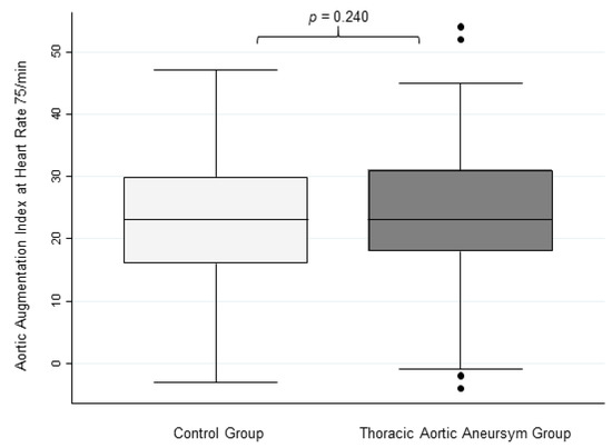 Although the unadjusted aortic AIx showed a significant difference between the TAA cohort and control subjects, TAA patients showed no significant difference in aortic AIx@75 compared with the control cohort (24.7 ± 11.2% vs. 22.8 ± 11.2%, respectively, Figure 3).