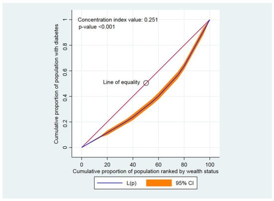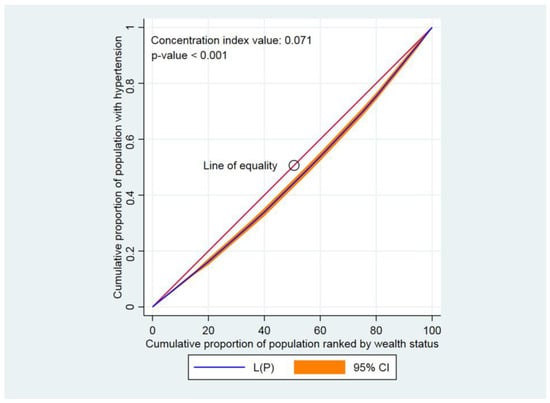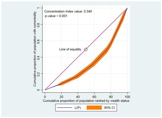 A positive concentration index value, or a CC that lay below the line of equality, specified that diabetes, hypertension, and comorbidity were higher among high wealth-indexed groups (high household wealth groups). Contrarily, a negative CIX value or a CC that lay above the line of equality indicated that diabetes, hypertension, and comorbidity were higher among low wealth-indexed groups [,]. Within the CC, greater inequality was established by how strongly the curves deviated from the equality line. CIXs were applied to compute the contrast in having diabetes, hypertension, and comorbidity []. CIX takes values between − 1 and + 1 []. When diabetes, hypertension, and comorbidity were similar across socioeconomic groups, CIX became 0. A positive CIX value implied that having diabetes, hypertension, or comorbidity was centered among the higher household wealth group. Conversely, a negative CIX value revealed that having diabetes, hypertension, or comorbidity was centered among the lower household wealth group []. Stata version 16.0 (StataCorp., College Station, TX, USA) was applied to analyze the CC and concentration index. The statistical significance was indicated at p < 0.05.