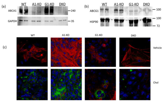 The primary purpose of this work was to attempt to uncover the atheroprotective roles of ABCA1 and ABCG1 expression in cultured VSMC. For our study, we utilized the well-characterized immortalized mouse aortic smooth muscle cell line MOVAS cells [29,30,31] for the generation of ABCA1 knockout (A1-KO) MOVAS cells, ABCG1 knockout (G1-KO) MOVAS cells, and ABCA1/ABCG1 double-knockout (DKO) MOVAS cells to compare to parental wild-type (WT) MOVAS cells. Using these cells, we tested the hypothesis that ABC transporter expression restores the VSMC phenotype in MLC by preserving apoAI/HDL-mediated cholesterol efflux. Interestingly, our results show HDL-mediated cholesterol efflux is still maintained in ABCG1-deficient MLC through SR-BI upregulation, which suggests that SR-BI plays a compensatory role in regulating HDL-mediated cholesterol efflux in VSMC/MLC when ABCG1-dependent cholesterol efflux is impaired.