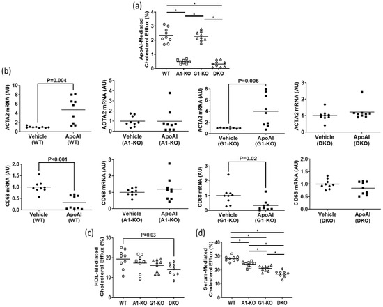 Using immunoblotting, we assessed ABCA1/ABCG1 deletion in KO MOVAS cells. We also treated cells with the LXR agonist GW3965 which robustly induces ABCA1/ABCG1 expression [32,33]. The rationale for GW3965 treatment was to attempt to stimulate ABC transporter expression that may be obscured in KO cell populations under normal conditions if cell populations are contaminated with unedited cells that still express endogenous ABCA1/ABCG1. In treated MOVAS cells, we showed the effective ablation of ABC transporter expression in the respective ABCA1/ABCG1 deficient cells (Figure 1a,b). Since edited cells sometimes lose phenotypic properties [37], we analyzed whether ABC transporter-deficient MOVAS cells could still convert into MLC [29,30]. As anticipated, MOVAS KO cells do transdifferentiate into MLC, as determined by the reduced expression of the VSMC marker ACTA2 coinciding with the induced expression of the macrophage marker CD68 [29] (Figure 1c). We proceeded to measure apoAI-, HDL-, and serum-mediated cholesterol efflux in WT and KO MOVAS MLC. We detected a striking decrease in apoAI-mediated cholesterol efflux in ABCA1-deficient MOVAS MLC (Figure 2a). This decrease in apoAI-mediated cholesterol efflux in ABCA1-deficient MOVAS MLC was also associated with an impaired ability to restore VSMC phenotype upon exposure to apoAI, as determined by failing to restore normal expression of the VSMC marker ACTA2 and the failure to suppress the expression of the macrophage marker CD68 (Figure 2b). However, when we measured HDL- and serum-mediated cholesterol efflux in WT and MOVAS KO MLC (Figure 2c,d), the reduction in HDL-mediated cholesterol efflux observed in ABCG1-deficient MOVAS MLC was not as striking when compared to the percent reduction observed in ABCA1-deficient MOVAS MLC for apoAI-mediated cholesterol efflux. Thus, this result implies alternative mechanisms may contribute to HDL-mediated cholesterol efflux other than ABCG1.