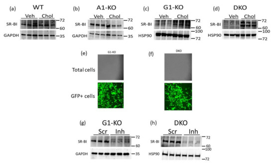 SR-BI can efflux cholesterol to HDL [22,25,38] and therefore may be a compensatory mechanism for VSMC/MLC to preserve HDL-mediated cholesterol efflux when ABCG1 expression is impaired. Hence, we assessed the SR-BI protein in WT and KO MOVAS cells that were either phenotypically normal (VSMC) or cholesterol-loaded to induce MLC transdifferentiation. Within the MOVAS-WT and MOVAS-A1KO cells, we observed no change in the SR-BI protein when comparing VSMC and MLC protein levels (Figure 3a,b). However, in ABCG1-deficient cells, we observed SR-BI upregulation in MLC when compared to VSMC (Figure 3c,d), potentially indicating that SR-BI is a possible facilitator for maintaining HDL-mediated cholesterol efflux in MLC that have impaired ABCG1 expression. To attempt to manipulate SR-BI expression in MOVAS-G1KO and MOVAS-DKO cells, we evaluated lentiviral transduction in these cells using GFP-expressing lentiviral vectors [39], and showed that lentivirus efficiently transduces these KO cell lines (Figure 3e,f). We then utilized lentivirus to knock down SR-BI in MOVAS-G1KO and MOVAS-DKO cells, which resulted in effective SR-BI protein downregulating (Figure 3g,h).