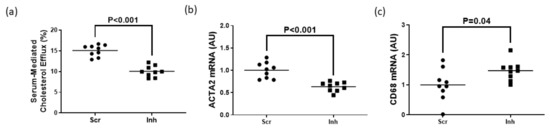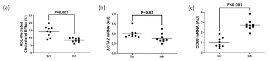 Inhibiting SR-BI in serum-incubated ABCA1/ABCG1 double deficient MOVAS MLC retards VSMC restoration by reducing cholesterol efflux. (a) Measuring serum-mediated cholesterol efflux in ABCA1/ABCG1-deficient MOVAS MLC transduced with a lentiviral vector expressing either an shRNA targeting SR-BI (Inh) or non-targeting scrambled control shRNA (Scr). (b,c) Expression of ACTA2 (b) and CD68 (c) mRNA measured in ABCA1/ABCG1-deficient MOVAS-MLC exposed to serum and transduced with Scr versus Inh. AU, arbitrary units.