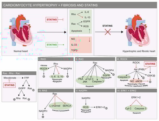 Beneficial effects of statins on the heart. Factors that stimulate cardiac hypertrophy and fibrosis are indicated in green and in red for factors that reduce cardiac hypertrophy and fibrosis (top). Statins inhibit hypertrophic and fibrotic pathways, as they have a stimulatory effect on factors that reduce both pathologies (red factors). The molecular details of these pathways are shown. In green, factors that stimulate or deteriorate hypertrophy, apoptosis, fibrosis and calcium homeostasis are shown. In red, factors that inhibit hypertrophy or fibrosis (bottom) are shown. The panel most to the left shows part of the mevalonate pathway and the way statins inhibit the important Ras, Rho and Rac proteins. Abbreviations: Cyt C: cytochrome c; EGFR: epidermal growth factor; FPP: farnesyl pyrophosphate; GGPP: geranylgeranyl-pyrophosphate; eNOS: endothelial nitric oxide synthase; ERK: extracellular signal-regulated protein kinase; GSKβ: glycogen synthase kinase 3 β; JNK: c-Jun N-terminal kinase; NADPH: nicotinamide adenine dinucleotide phosphate; NO: nitric oxide; PKA: protein kinase A; PKB: protein kinase B; ROS: reactive oxygen species; TGFβ: transforming growth factor-β; SERCA: sarcoplasmic reticulum Ca2+ ATPase.
