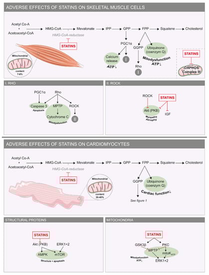 While the adverse effects of statins on skeletal muscle received much attention, remarkably little is known about the effects on the heart, our body’s most hard-working muscle. Negative effects of statins on the mitochondrial function of cardiomyocytes have, however, been recently described in vitro and in vivo (i.e., in mice) [], but have so far not been reported clinically. Statins have also been shown to beneficially affect cardiomyocyte function and metabolic activity [,,,,]. This raises the question of what could explain these contrasting results between various model systems and within the clinical setting. Here, we discuss all previously reported effects of statins on cardiac muscle using pharmacokinetic, morphological, physiological and metabolic differences between skeletal and myocardial tissue that may explain the differences observed between these tissues. Finally, we will reflect on the consequences of these effects for statin therapy in specific patient groups and the potential need for a more personalized therapy.