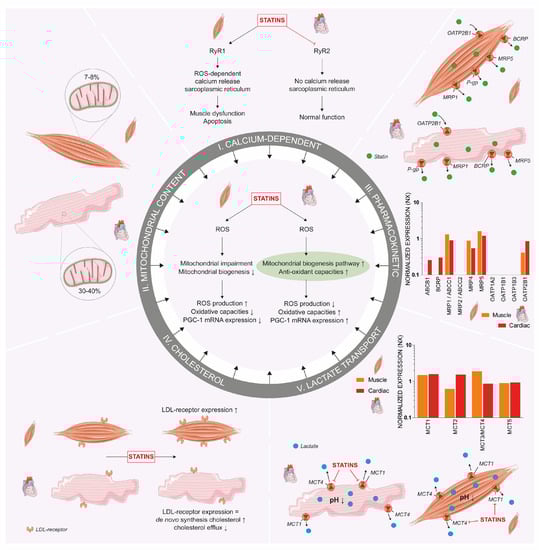 Although a decreased metabolic capacity after long-term statin treatment seems to play a role in skeletal muscle complaints, the clinical phenotype in the heart is different. The differences between skeletal muscle cells and cardiomyocytes remain interesting and could hence provide leads to obtain better insight into the pathomechanisms of the potential adverse effects in both cell types. Here, we have discussed five possible mechanisms that could explain the difference in statin effects on cardiac and skeletal muscle, including, variations in the regulation of mitochondrial biogenesis and redox balance, difference in baseline mitochondrial content, variability in membrane transporters mediating cellular statin uptake and efflux, differences in cholesterol homeostasis and variability in lactate transport (i.e., mitohormesis 2.0 hypothesis).