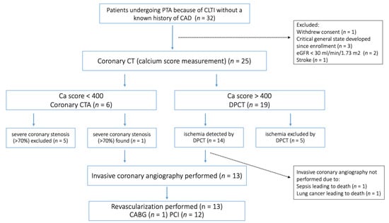Study flowchart. PTA, percutaneous transluminal angioplasty; CLTI, chronic limb-threatening ischemia; CAD, coronary artery disease; eGFR, estimated glomerular filtration rate; CTA, computer tomography angiography; DPCT, dynamic perfusion computer tomography; CABG, coronary-artery bypass graft surgery; PCI, percutaneous coronary intervention.