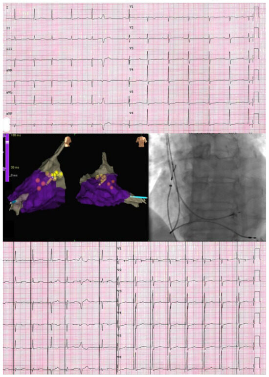 Figure 1. The upper part of the image shows the spontaneous ventricular activation as a twelve-lead ECG. On the left, a 3DEAM of the RV is displayed in the central part, with highlighted yellow dots representing the His bundle. The yellow catheter corresponds to the His bundle lead, while the light blue catheter represents the RV backup lead. On the right, a fluoroscopic anterior-posterior view of the His lead and the RV backup lead is shown in the central part. An ECG with selective HBP is shown in the inferior part of the image.