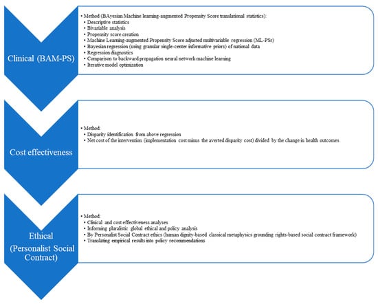 The 2016, 2017, 2018, 2019, and 2020 National Inpatient Sample (NIS) datasets were selected for this study as they are among the latest available datasets and the first to use ICD-10 coding and so better reflect current clinical trends in diagnoses, procedures, and outcomes compared to prior years. Study inclusion criteria included all NIS hospitalizations for adults aged 18 years or older during the above index time periods. This study utilized NIS data according to the ethical principles in the Declaration of Helsinki and the regulatory standards of the nation of origin (and thus did not require IRB review, exempt determination, or informed consent as confirmed by the United States National Bureau of Economic Research and the Department of Health and Human Services’ Agency for Healthcare Research and Quality [AHRQ]). Integrated comprehensive analysis detailed below was conducted using an AI-driven Computational Ethics and policy analysis (AiCE), including the first empirical step (BAM-PS detailed below, featuring a propensity score-based clinical analysis then a cost effectiveness analysis) followed by the second ethical step (using the Personalist Social Contract ethics framework to inform a computational ethical and policy analysis to advance the translation of the above results into equitable and effective health policy) (Figure 1).