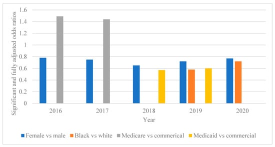 Despite fully adjusted for clinical confounders, females versus males were significantly less likely to receive PCI across all five years, while in 2018–2019, Medicaid versus commercial and, in 2019–2020, African Americans versus Caucasians were significantly less likely to receive PCIs (Figure 2). The greatest disparities were in 2018, specifically for females (OR 0.65, 95%CI 0.52–0.80, p < 0.001) and Medicaid (OR 0.57, 95%CI 0.34–0.96, p = 0.036). There were no other significant and independent disparities.