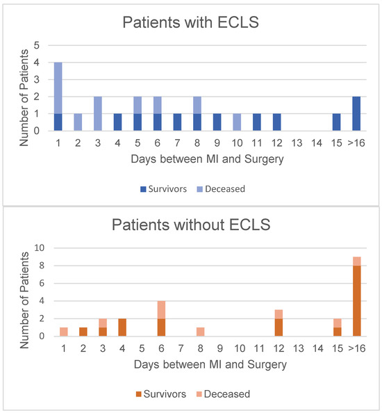 Correlation between time to surgery after diagnosis and mortality. It is evident that in both groups, a longer time interval between MI and surgery translated into higher survival rates. This is marked in the ECLS group (above) after day 7. In the group without ECLS (below), it is evident that most patients underwent surgery over 2 weeks after their initial MI.