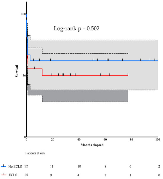 The longest follow-up time was 6.66 years in the ECLS group and 8.33 years in the group without ECLS, a difference attributable to when ECLS therapy was implemented: around 2011 in both centers. Just like our study’s primary outcome, long-term mortality did not differ statistically between the groups despite the challenges that our patients and medical teams encountered during their treatment.
