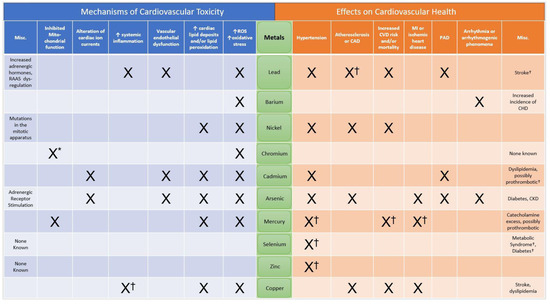 APA StyleLundin, K. K., Qadeer, Y. K., Wang, Z., Virani, S., Leischik, R., Lavie, C. J., Strauss, M., & Krittanawong, C. (2023). Contaminant Metals and Cardiovascular Health. Journal of Cardiovascular Development and Disease, 10(11), 450. https://doi.org/10.3390/jcdd10110450