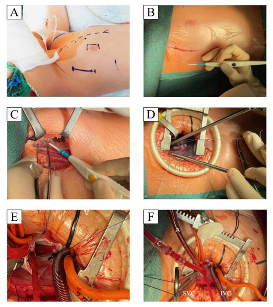 Patient preparation and surgically relevant steps: (A) Patient reference marking for MRAT incision, right nipple, and potential bail-out sternotomy; the patient is placed in partial left decubitus with the right arm lifted gently above the head. (B,C) limited skin incision and muscle sparing with preservation of the long thoracic nerve. (D) Soft tissue and finocchietto exposure with pericardial suspension. (E) atrial septal defect visualization with central cannulation. (F) atrial septal defect patch closure.