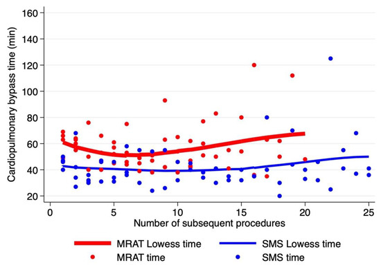 Time of cardiopulmonary bypass time according to the number of procedures starting from the first operation. MRAT (in red dot and line) vs. SMS (in blue dot and line). Lines represent Lowess cardiopulmonary bypass time for each approach (locally weighted scatterplot smoothing).
