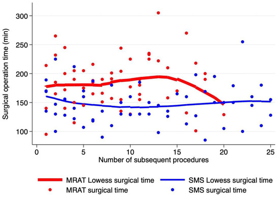 Time of surgical operation, determined as skin-to-skin time (min), according to the number of procedures starting from the first operation. MRAT (in red dot and line) vs. SMS (in blue dot and line). Lines represent Lowess surgical time for each approach.