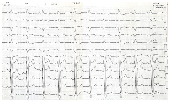 Initial ECG recording showing sinus rhythm with a left bundle branch block morphology. ECG, electrocardiogram. ECG–electrocardiogram.