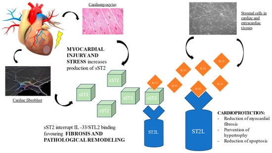 The cognate ligand of ST2 is interleukin-33 (IL-33), a cardiac fibroblast protein released by stromal cells in cardiac and extracardiac tissues. Depending on co-stimulatory factors, IL-33 can act either as a pro- or anti-inflammatory cytokine. At the cardiac level, the ST2L/IL-33 interaction initiates a complex cardioprotective biochemical cascade, which prevents cardiomyocyte hypertrophy, apoptosis, and myocardial fibrosis, thereby improving cardiac function. However, when the heart is subjected to damage or mechanical stress, cardiomyocytes and cardiac fibroblasts secrete sST2, which, competing with ST2L for the IL-33 binding site, antagonizes the cardioprotective effect, contributing to myocardial fibrosis and ventricular remodeling [12,19,20]. (Figure 1) Hence, the activation of the ST2L/IL-33 pathway is a beneficial adaptive response in cardiac disease, which is offset by sST2 secretion.