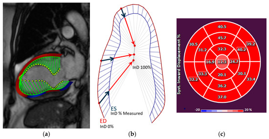 (a) The inward motion of the endocardial wall towards the LV “center of contraction” (demonstrated by the green lines) represents the effective result of LV contraction, comprising a combination of longitudinal and radial motion that gives rise to the reduction in the LV volume. InD is evaluated using Medis’ feature-tracking technology. (b) InD is a value defined for each point of the endocardial border from end-diastole (ED) to end-systole (ES), given by the component of the displacement vector that is directed toward the LV center. The position of the LV centerline is located along the LV axis with a position that varies from one half to two-thirds of the base-to-apex distance, for the basal to the apical regions, respectively. Regional InD was measured in millimeters (mm) and is expressed as a percentage (%); 0 % represents the absence of contraction and 100% corresponds to a theoretical limit at which the LV shrinks to zero volume at its centerline. InD is measured starting from the end-diastolic (ED) frame. Its value normally increases in each segment during systole to reach a positive peak value at end-systole (ES). It then decreases during the phases of diastole to eventually return to zero at end-diastole. (c) After InD is measured for the three standard long-axis views of the LV, the results are plotted on a standard AHA 17-segment bullseye diagram to depict the measured value for each LV segment. Abbreviations: LV, left ventricular; InD, inward displacement; ED, end-diastole; ES, end-systole.