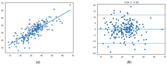 (a) Scatterplot showing a significant linear relationship between InD measurements between observers (x-axis, observer 1; y-axis, observer 2) (R = 0.80, p < 0.0001). (b) Bland–Altman plot showing the mean differences of segmental InD measurements between different observers (x-axis, mean of two measurements; y-axis, difference between two measurements).