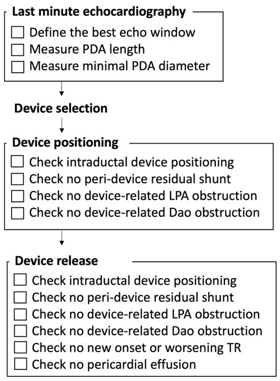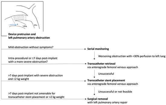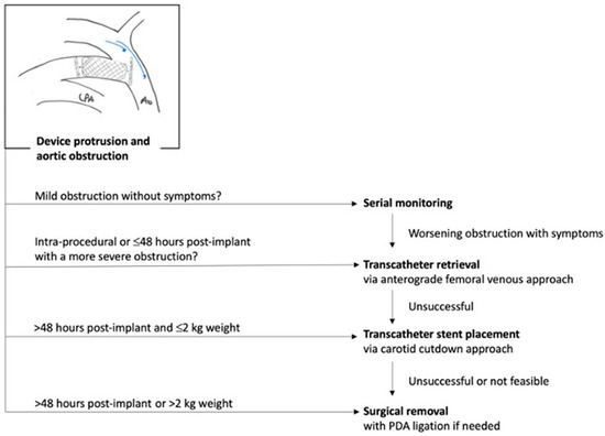 It is noteworthy that along with growing experience, the rate of MAE significantly decreases, dropping from a 10–15% rate of MAE in series <30 patients [5,6,7,11] to a 4–5% rate of MAE in series >60 patients [8,9,10] (Table 1). The incidence of new onset or worsening of tricuspid valve regurgitation in <2 kg infants was 5% in the premarket trial [10] and 4.1% in the French multicenter study [9]. The most common cause of tricuspid regurgitation is injury to the chordae of the septal leaflet of the tricuspid valve, which may become damaged during the catheter crossing of the valve. In the long-term, patients continue to display persistent, unchanged (mild or severe) tricuspid regurgitation without clinical consequences [36]. The incidence, mechanisms and guidelines for the prevention and management of major procedural complications has been summarized in a recent expert consensus statement [4]. Algorithms for the management of device-induced left pulmonary obstruction or aortic obstruction are summarized in Figure 4 and Figure 5, respectively. In the long term, Morray et al. reported high rates of PDA closure and survival of >95% at 3 years with 9/200 reported deaths that were not adjudicated as device- or procedure-related [36].