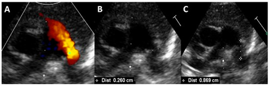 Device deployment and positioning is performed using echocardiography and/or fluoroscopy. As a rule, the device is entirely placed intraductally in infants weighing less than 2000 g, avoiding the uncovered PDA segment at the pulmonary end [30]. Successful positioning is defined by the complete occlusion of the duct with no peri-device residual shunting, and the absence of aortic or LPA obstruction by echocardiography (Figure 3). Following the release of the device, careful echocardiographic assessment is repeated, paying particular attention also to the tricuspid valve function and to the pericardium. The patient is then transferred back to the neonatal intensive care unit for close clinical monitoring and follow-up echocardiography within the first post-procedural 24 h.