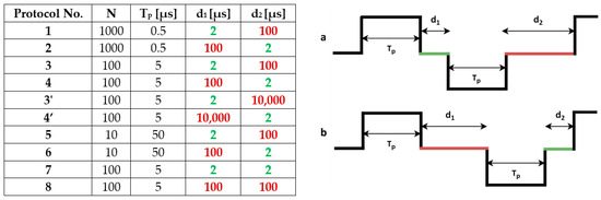 Values of the pulse parameters for the biphasic pulse protocols included in the study. All protocols have equal total on-time, i.e., N × 2Tp = 1 ms. Tp—pulse width (equal for positive and negative phase); N—number of pulses; d1—interphase delay; d2—interpulse delay. (a) Scenario one: short d1 and long d2 (protocols 1, 3, 3′ and 5); (b) scenario two: long d1 and short d2 (protocols 2, 4, 4′ and 6). Additionally, protocols 7 and 8 (with equal d1 and d2) were added for comparison and tested in the ex vivo study.