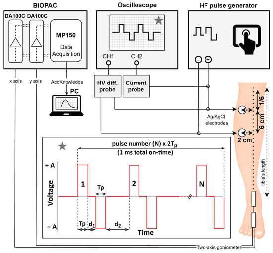 Experimental setup and electrode/goniometer placement. The stimulation pulses were delivered via electrodes connected to the high-frequency (HF) pulse generator. The electrodes (marked with circles) were placed on the right leg: the upper electrode was placed on 1/6th of the tibia’s length; the lower electrode was placed 6 cm lower. Both electrodes were placed 2 cm right lateral to the bone (left in the figure). The output pulses were monitored on an oscilloscope using high-voltage (HV) differential and current probe. Asterisk: applied pulses—biphasic pulses with 1 ms total on-time. Tp—pulse width (equal for positive and negative phase), d1—interphase delay, d2—interpulse delay, N—number of pulses. The response from the ankle (muscle contraction response) was acquired with twin-axis goniometer connected to the Biopac unit (x-axis (channel) determining foot dorsiflexion/plantarflexion, y-axis (channel) determining foot abduction/adduction). The data were analyzed on a personal computer (PC) using the AcqKnowledge software 4.0
