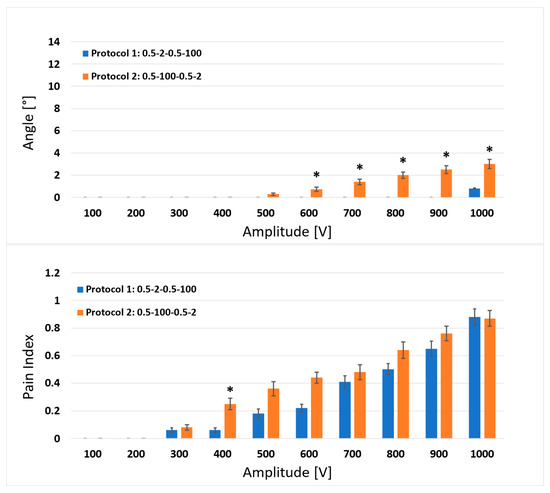 Comparison of the results between protocol 1 (0.5-2-0.5-100 µs) and protocol 2 (0.5-100-0.5-2 µs) for the muscle response (upper graph) and pain index (lower graph). Each bar represents one pulse protocol (Tp-d1-Tp-d2) for the stated amplitude on the x-axis. The results are shown as the mean value (bar’s height) ± standard error (black vertical bars). The asterisks (*) show statistically significant differences between the pulse protocols at the stated amplitude (p < 0.05).
