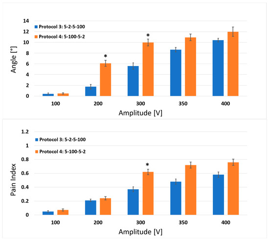 Comparison of the results between protocol 3 (5-2-5-100 µs) and protocol 4 (5-100-5-2 µs) for the muscle response (upper graph) and pain index (lower graph). Each bar represents one pulse protocol (Tp-d1-Tp-d2) for the stated amplitude on the x-axis. The results are shown as the mean value (bar’s height) ± standard error (black vertical bars). The asterisks (*) show statistically significant differences between the pulse protocols at the stated amplitude (p < 0.05).