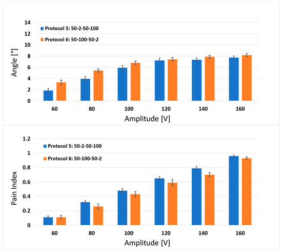 Comparison of the results between protocol 5 (50-2-50-100 µs) and protocol 6 (50-100-50-2 µs) for the muscle response (upper graph) and pain index (lower graph). Each bar represents one pulse protocol (Tp-d1-Tp-d2) for the stated amplitude on the x-axis. The results are shown as the mean value (bar’s height) ± standard error (black vertical bars).