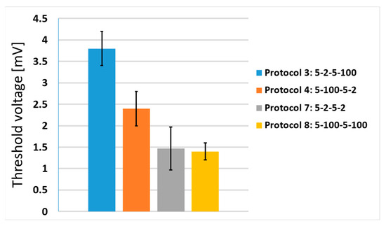 In Figure 6, we present the results of the phrenic nerve stimulation study. Four different protocols were tested in this study: protocols 3, 4, 7 and 8 (see Figure 1). Note that the latter two protocols were not tested in the clinical study described in Section 2.1 and Section 3.1. All protocols had the same number of pulses (100) and pulse width (5 µs); only the interphase delay (d1) and interpulse delay (d2) were different. It can be observed that protocol 3 (5-2-5-100 µs) resulted in the highest threshold voltage compared to the other tested protocols. Interestingly, protocols 7 and 8 had almost the same threshold voltage, both being lower than the threshold voltage for protocol 4.