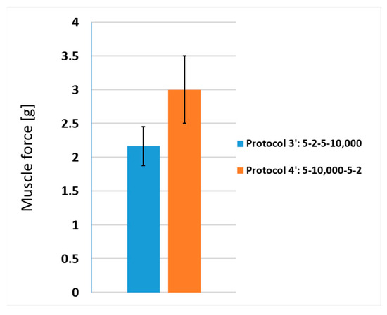 In Figure 7, we present the results of the esophagus stimulation studies; two different protocols were tested. Both protocols employed the same number of pulses (100) and pulse widths (5 µs), while the interphase delay (d1) and interpulse delay (d2) were alternated. Due to the low impedance of the muscle baths (6–8 Ω), the protocols were adjusted to have longer delays (10,000 µs instead of 100 µs) in order to refill the capacitors as required. Thus, protocols 3 and 4 were modified into protocols 3′ (5-2-5-10,000 µs) and 4′ (5-10,000-5-2 µs). It can be observed that protocol 3′ elicited lower muscle forces compared to protocol 4′, which is in accordance with the results presented in Figure 4.