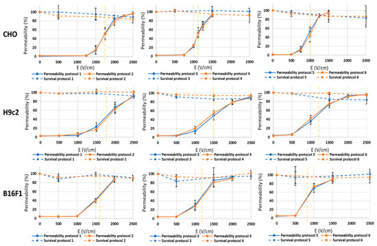 Cell membrane permeability and cell survival for protocols 1–6 for three different cell lines: CHO (first row), H9c2 (second row) and B16F1 (third row). The results are shown as the mean value of three repetitions (each point) ± standard deviation (black solid vertical bars). The yellow dashed vertical lines present the threshold values (determined at 50% permeability).