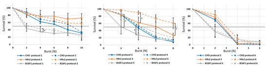 Increasing the burst number for protocols 1–6 for three different cell lines (CHO, H9c2 and B16F1): protocol 1–2 (first left graph), protocols 3–4 (middle graph) and protocols 5–6 (last right graph). The results are shown as the mean value of three repetitions (each point) ± standard deviation (black vertical bars). The asterisks (*) show statistically significant differences between the pulse protocols at the stated number of bursts (p < 0.05). The black dashed horizontal lines determine 50% cell survival.